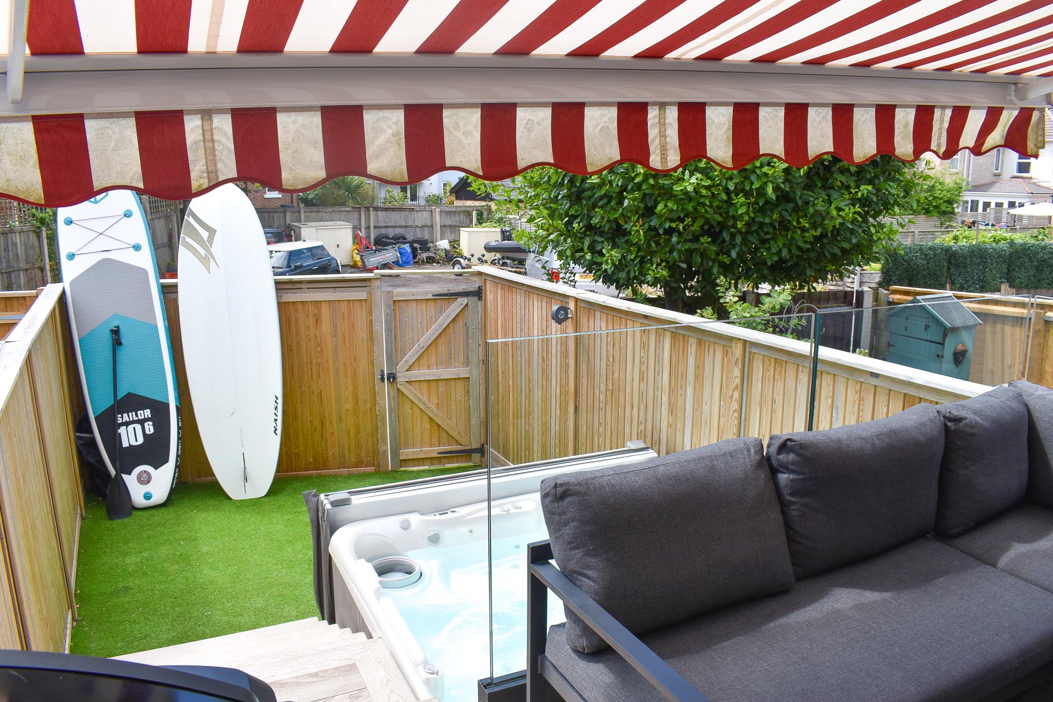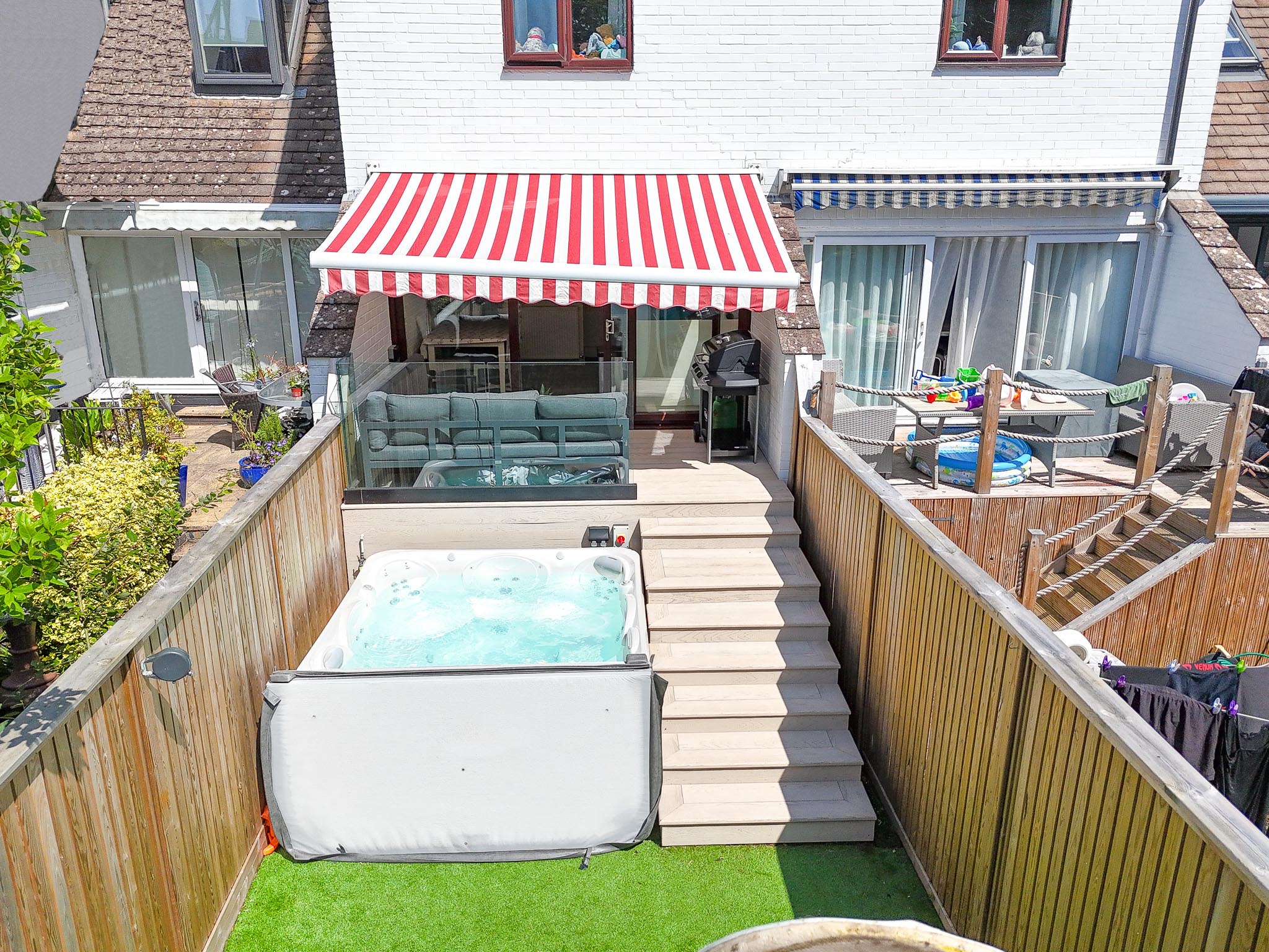 To the rear, the garden has been recently reimagined for effortless outdoor living. Set across two levels, it features premium Millboard decking, newly installed high-quality fencing for added privacy, and a generous seating and BBQ area ideal for entertaining. From here, step directly into a luxurious six-person hot tub or relax on the low-maintenance AstroTurf lawn, designed for year-round enjoyment.