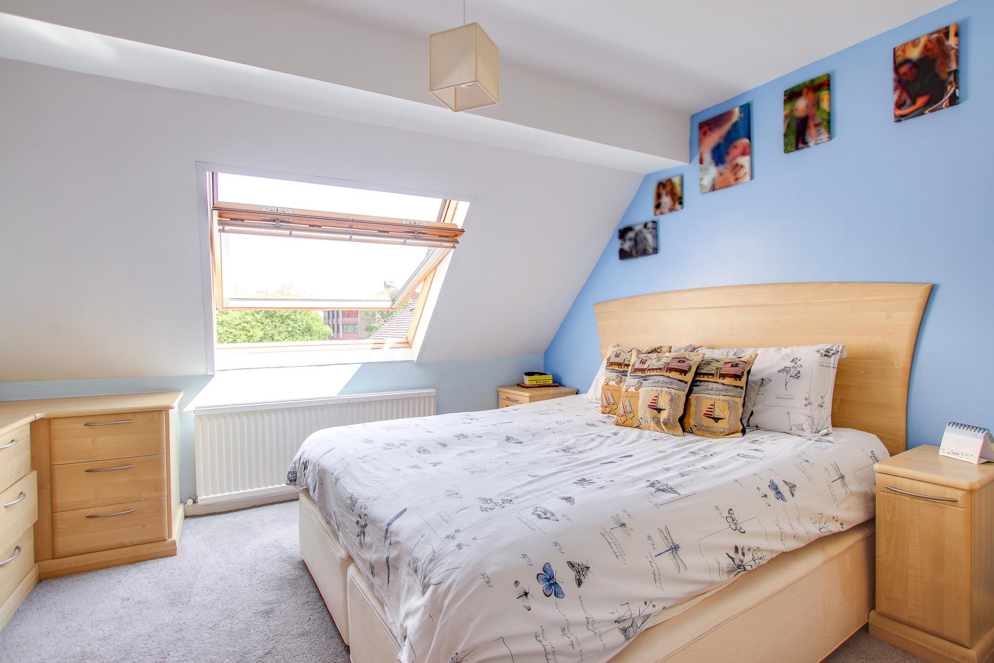 Up another level, the master bedroom greets you with stunning river views through a large Velux window. Featuring built-in bedroom furniture and flooded with gentle morning light, this tranquil space offers a serene and restful atmosphere.