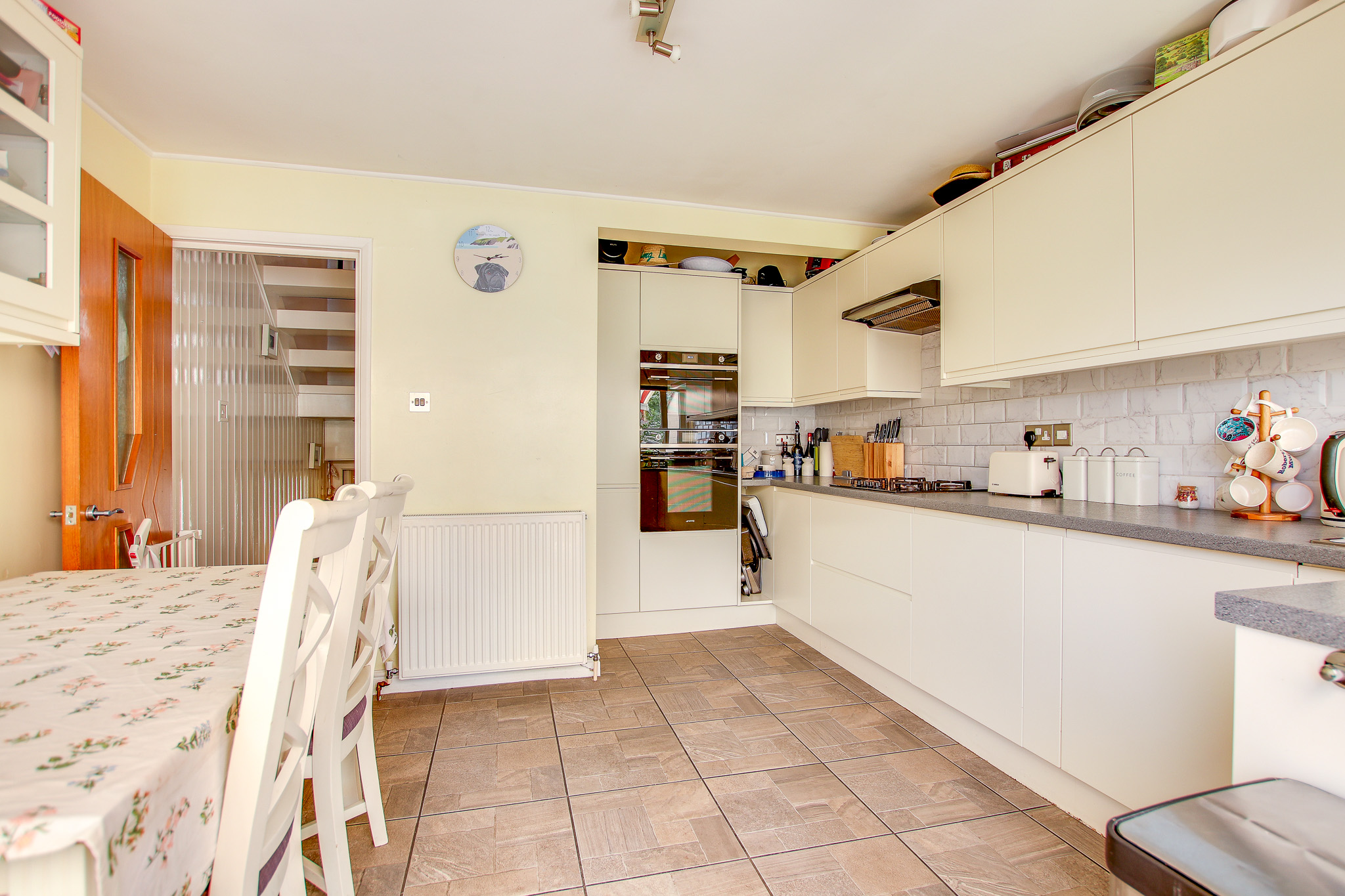 Ascending a flight of stairs brings you into the heart of the home, the kitchen and dining area. Equipped with sleek wall and floor units and stylish SMEG appliances including a double oven, hob, and dishwasher, this house is made for relaxed living. Sliding doors open onto a west-facing sun terrace and rear garden, ideal for evening drinks or alfresco dining under the summer sun.