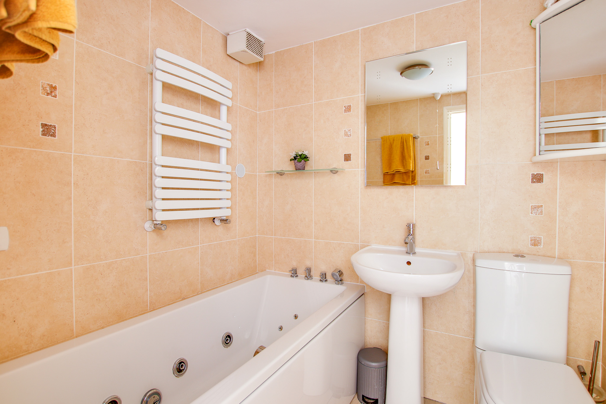 The first bedroom you’ll find is a generous double at the rear, offering peaceful garden views and ample built-in wardrobe space, perfect for guests or extra storage. Just next door, the fully tiled family bathroom boasts a luxurious Jacuzzi bath WC, wash basin, and extractor fan.