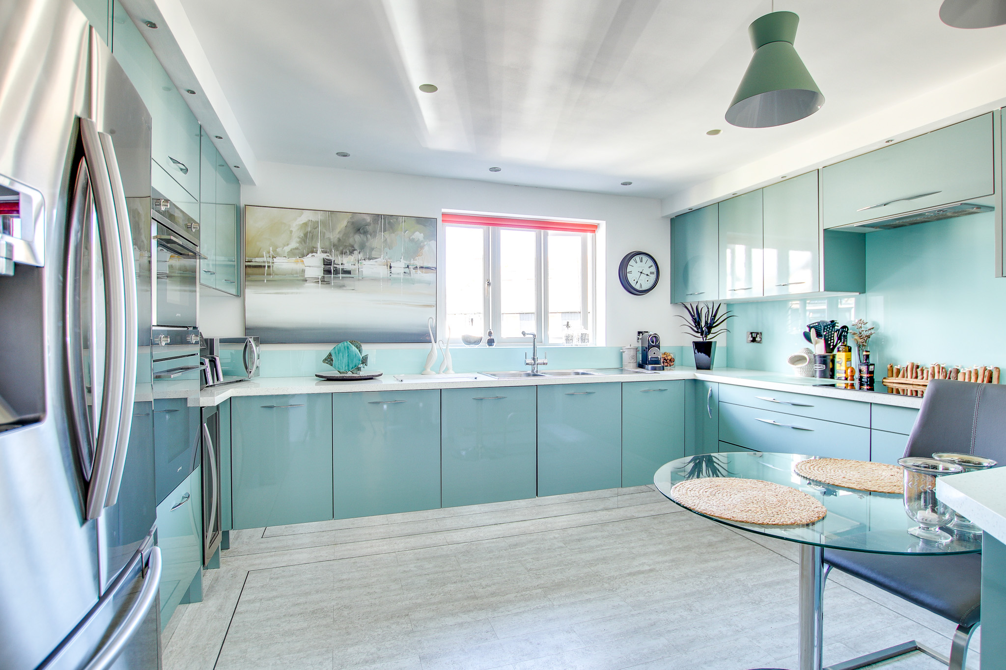 Back off the hallway, there is a door to the separate, modern kitchen. This well-appointed space features a contemporary range of wall-mounted and floor- standing units with sleek, wraparound work surfaces. There is space for a large American-style fridge/freezer, integrated appliances throughout, and a stainless steel sink positioned beneath an east-facing window.