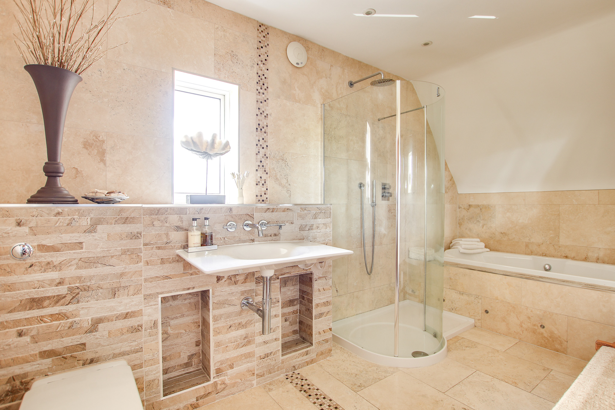 Also on the first floor is bedroom four, which could easily serve as a home office or snug sitting room. And there is also a stylish wet room with WC, wash hand basin, and open shower area, finished with modern tiling throughout just off the hallway.