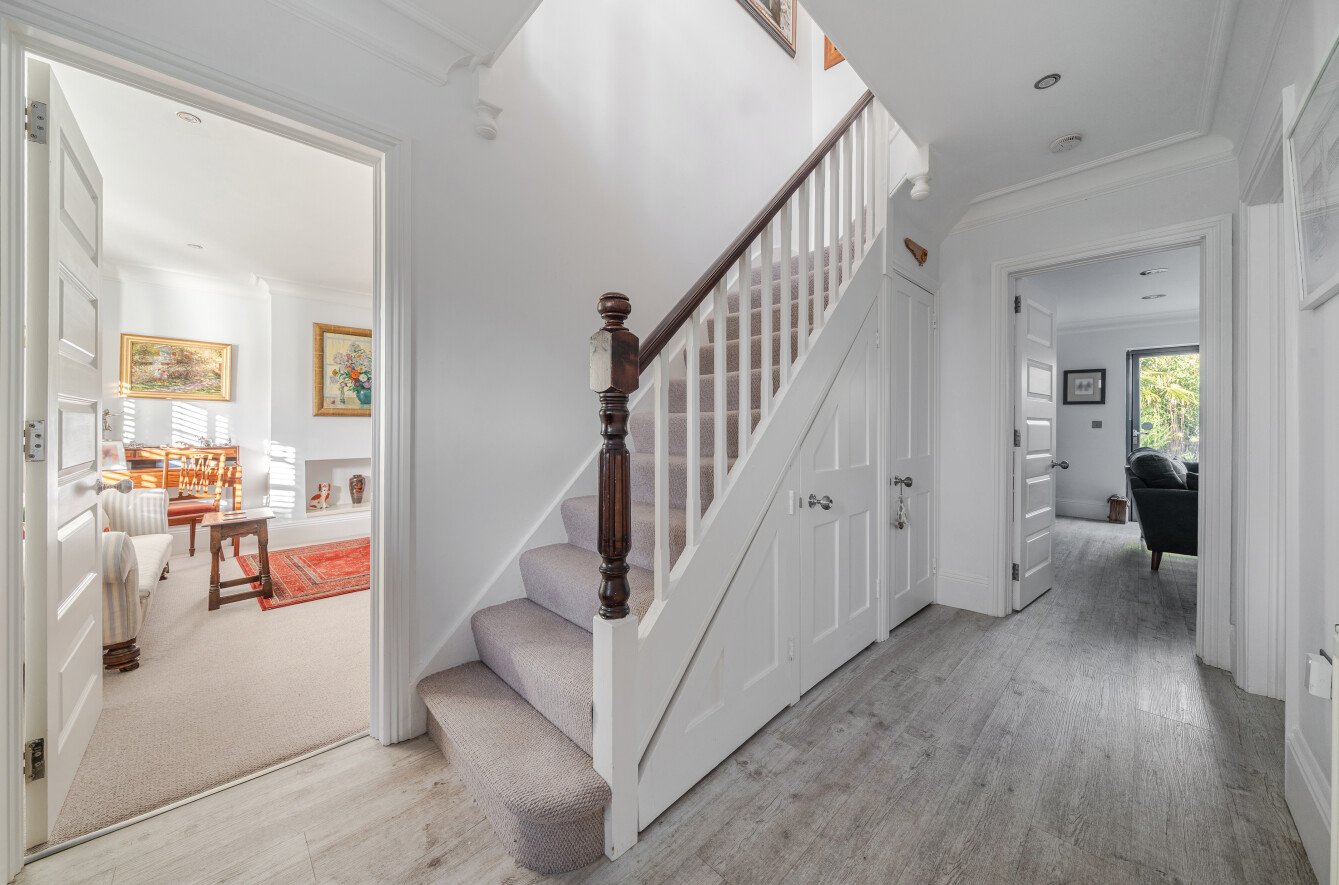 The property has been comprehensively improved to seamlessly blend its original character with an array of contemporary features. A standout aspect is the highly flexible arrangement of reception rooms on the ground floor, offering exceptional versatility. The layout lends itself to grand-scale entertaining, while two additional reception rooms provide more intimate spaces ideal for relaxing or enjoying family life. At the heart of the home is a well-appointed kitchen/dining space, fitted with a range of high-quality appliances and forming the central hub of the property. Both the garden room and family room benefit from bi-fold doors opening onto a beautifully landscaped yet manageable rear garden. The garden room is particularly impressive, featuring contemporary glazed corner doors and a striking vaulted atrium ceiling that floods the space with natural light and effortlessly connects indoors with out. The home features a convenient utility room and a spacious laundry room, providing plenty of extra storage for all your essentials. The first floor offers three generous double bedrooms each served by its own en-suite bathroom and a fourth double bedroom currently used as a study. The bedroom layout allows the principal suite to be privately positioned, complete with a walk-in dressing room and balcony. All bathrooms are finished to an excellent standard with modern suites, while two retained balconies, accessed from the dressing room and landing, provide attractive rooftop views to the front of the property.