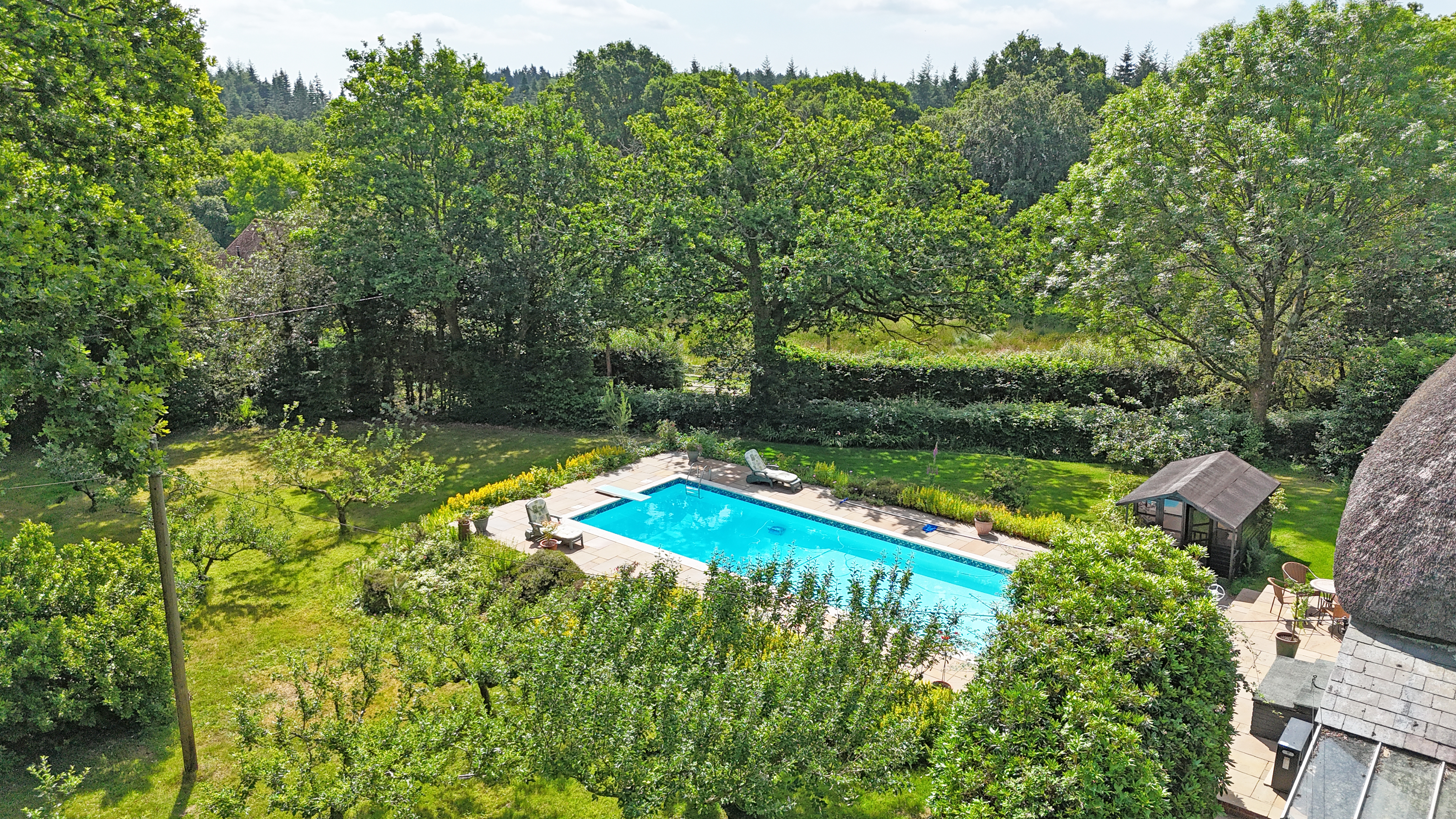 Dating back to around 1921 and sympathetically extended and improved over the years is this delightful thatched four-bedroom period property offering ample living accommodation throughout. Further outbuildings and stables provide further flexible accommodation whilst all being situated in a lovely elevated, quiet and peaceful location all sat on an acre plot and boasting a lovely, heated swimming pool.