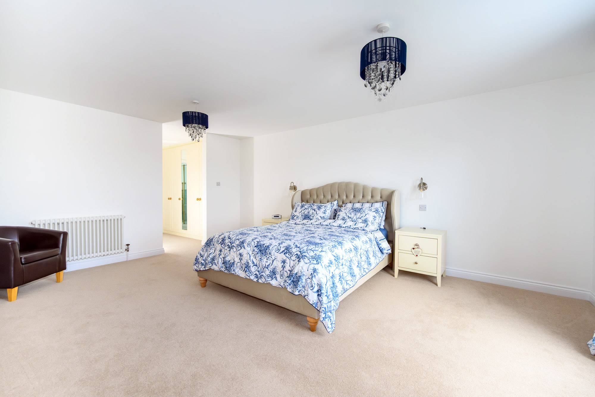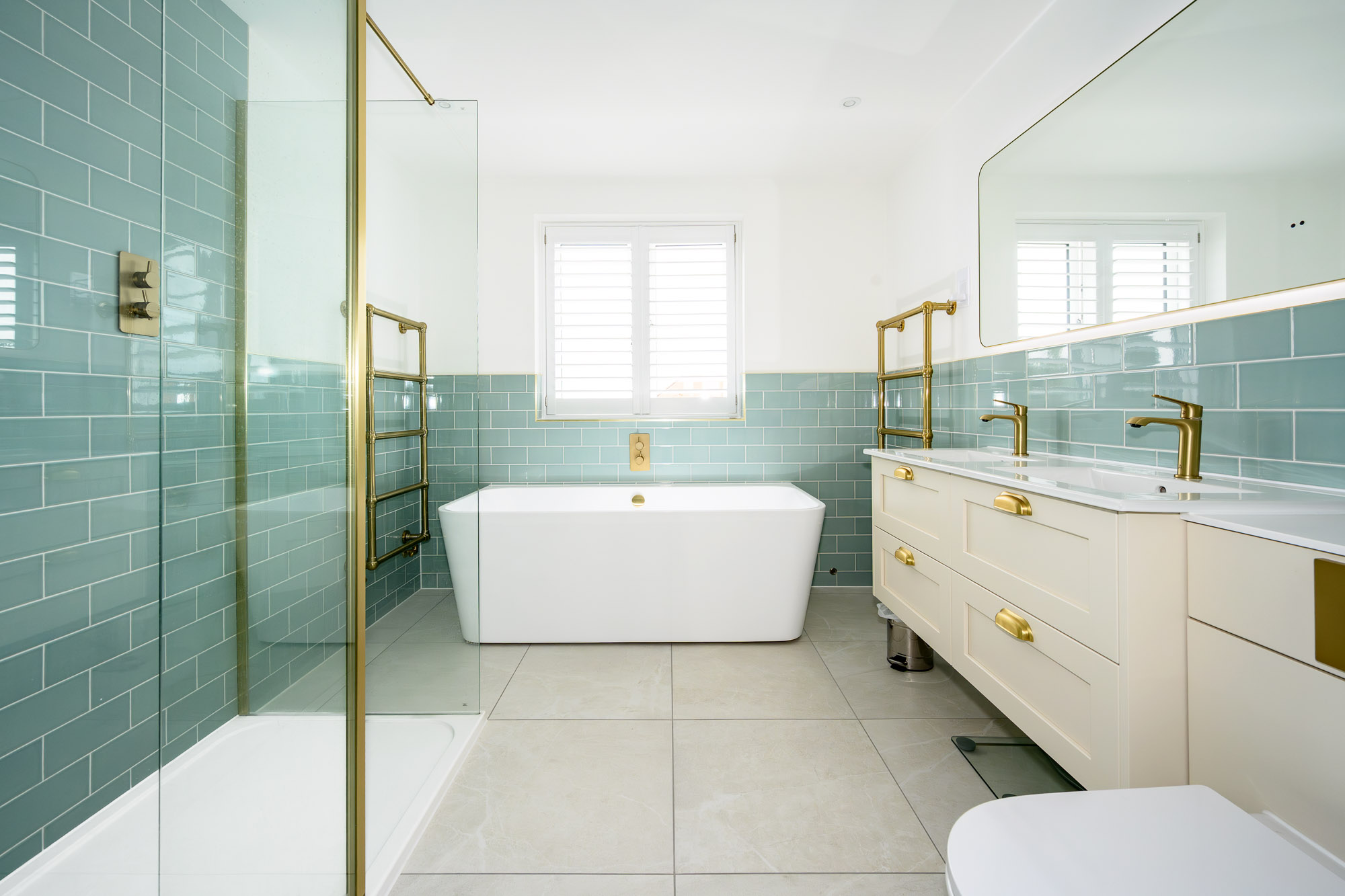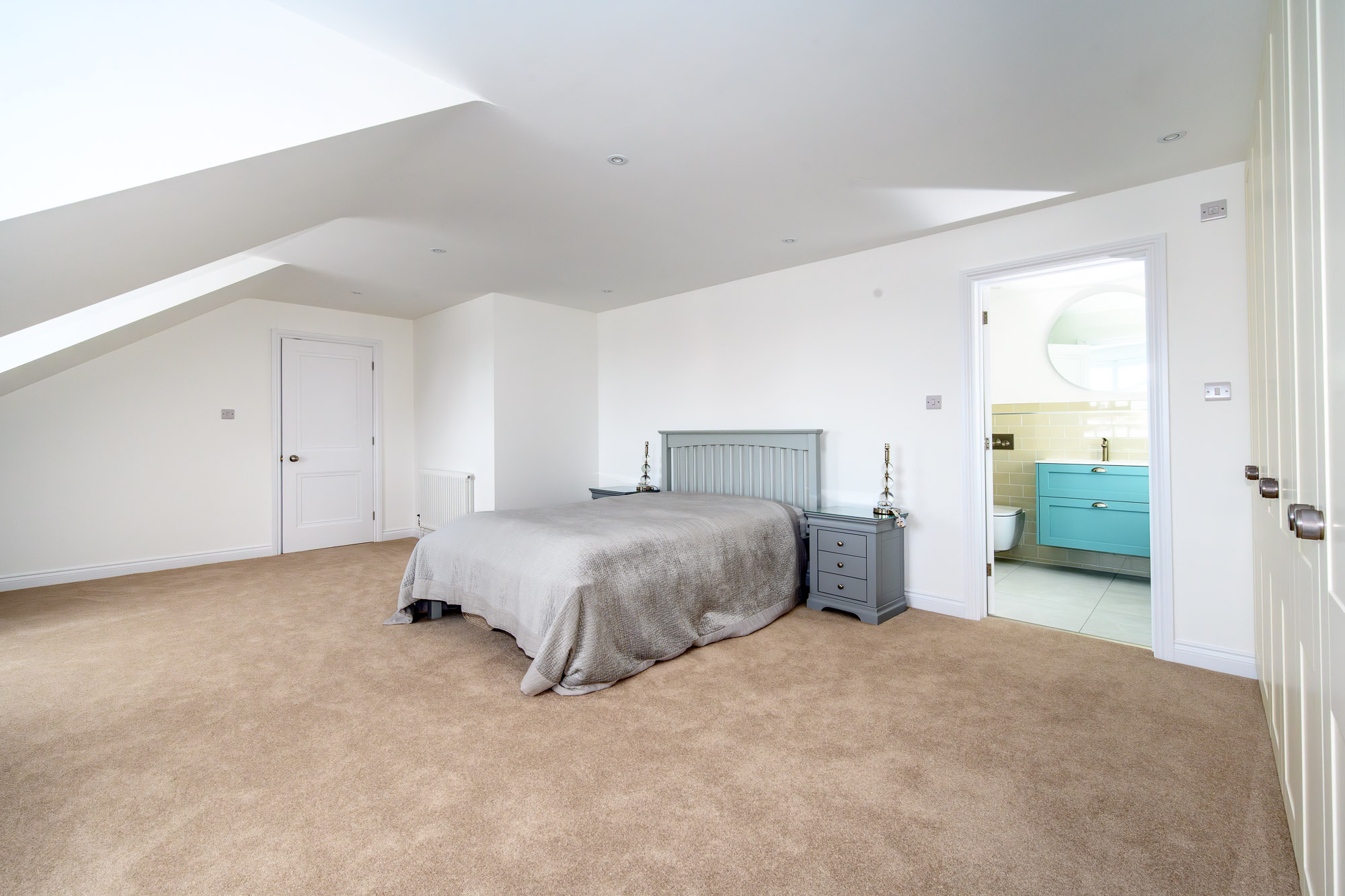 Bedroom three is a large double room at the rear of the property with its own en-suite, including a walk-in shower, WC, and basin.