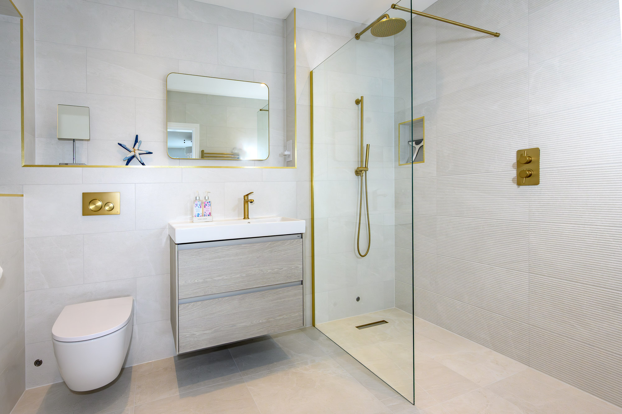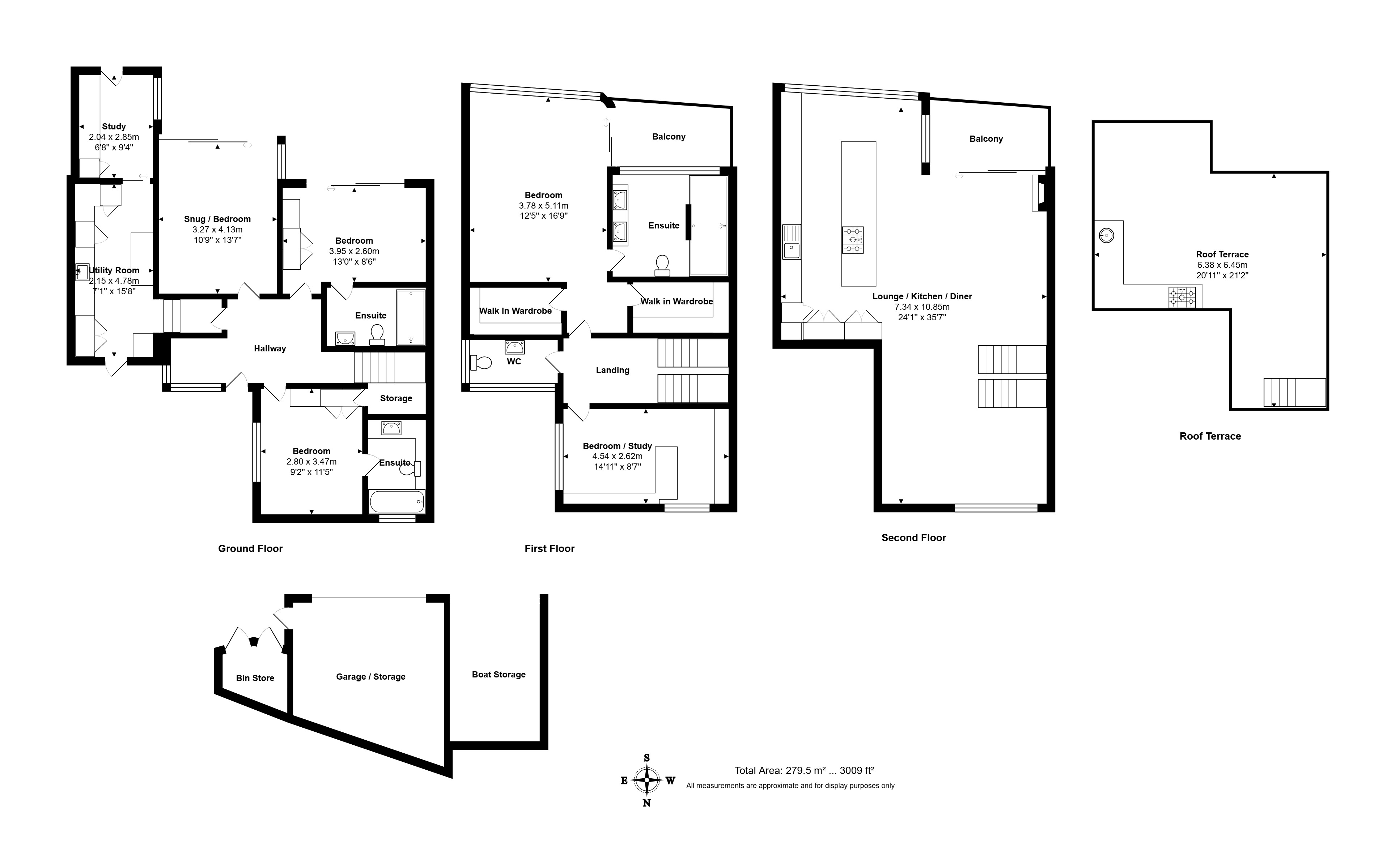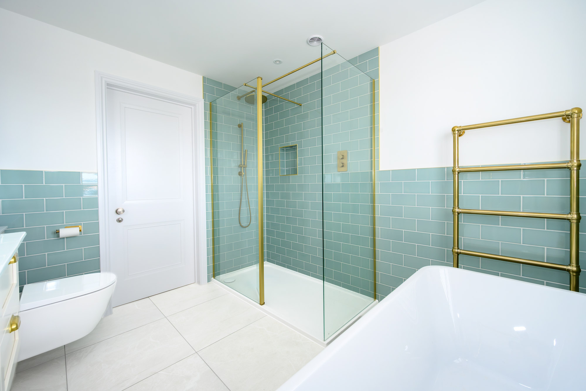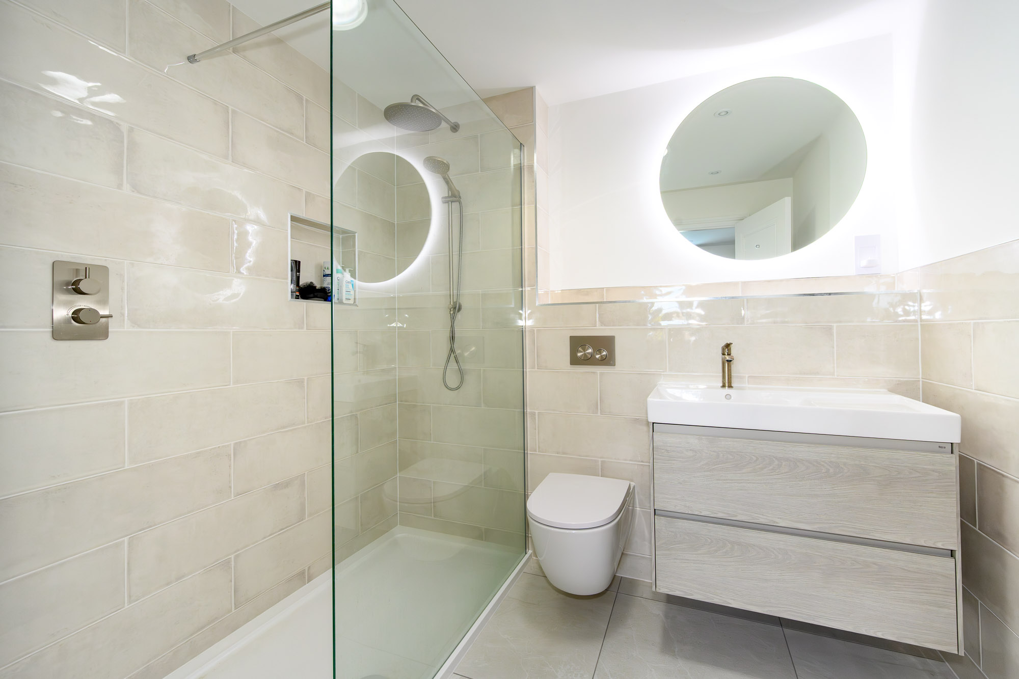 Bedroom three is a large double room at the rear of the property with its own en-suite, including a walk-in shower, WC, and basin.
