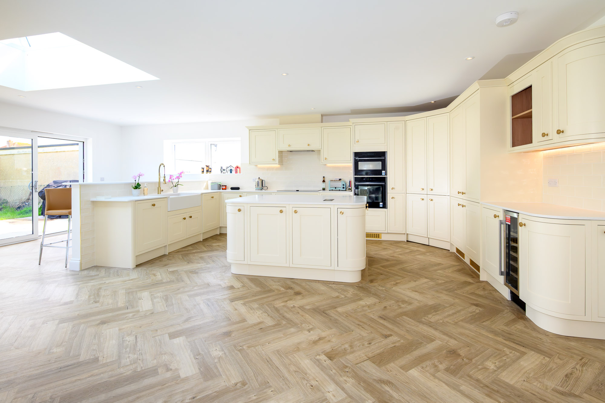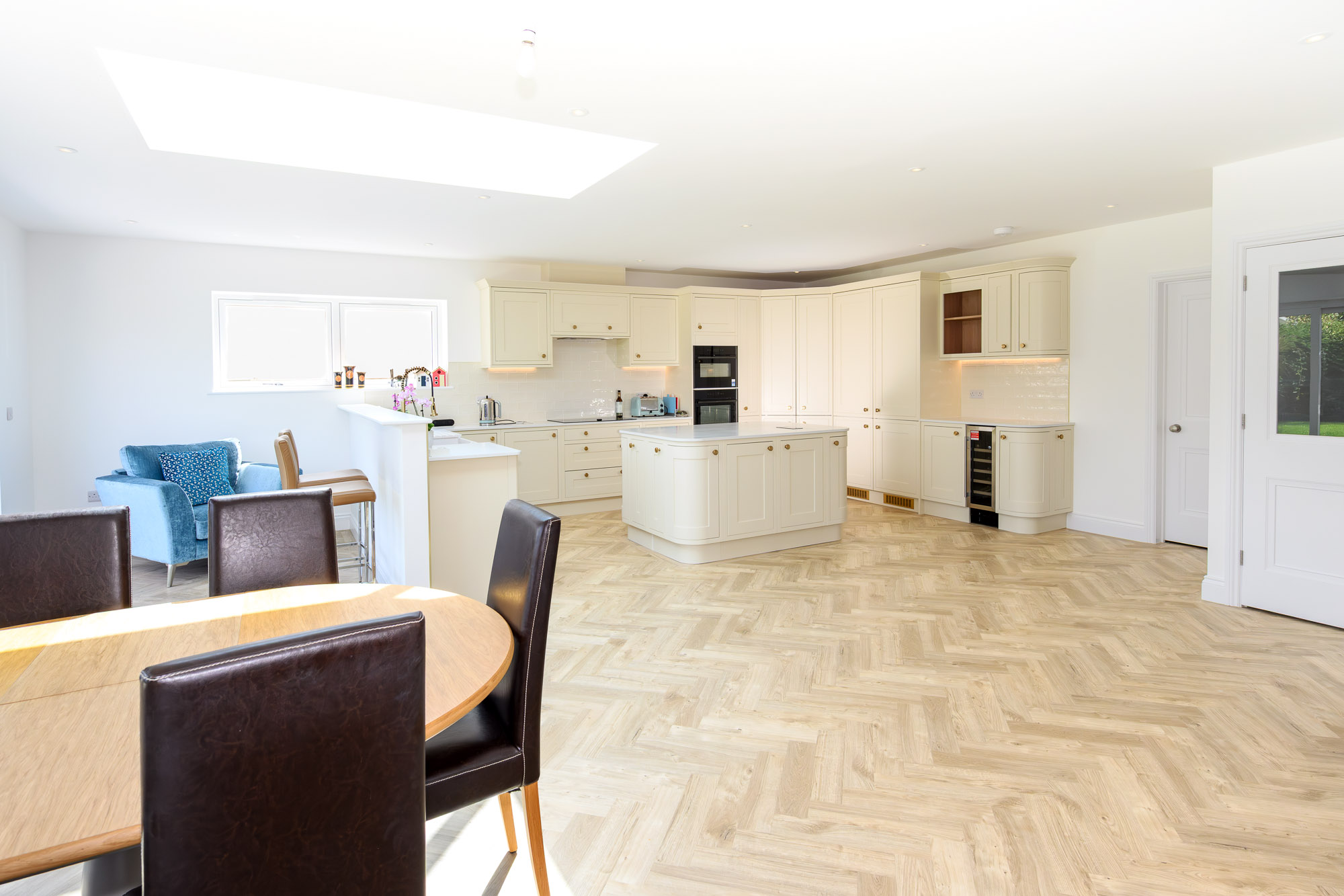 A large central island forms the heart of the kitchen, complemented by contemporary wraparound worktops, a sleek under-mounted sink, integrated eye-level oven, fridge/freezer, dishwasher, wine cooler, and ample wall and base units. A striking sky lantern floods the space with natural light, and full-width patio doors open out to the rear terrace, perfect for indoor-outdoor living.