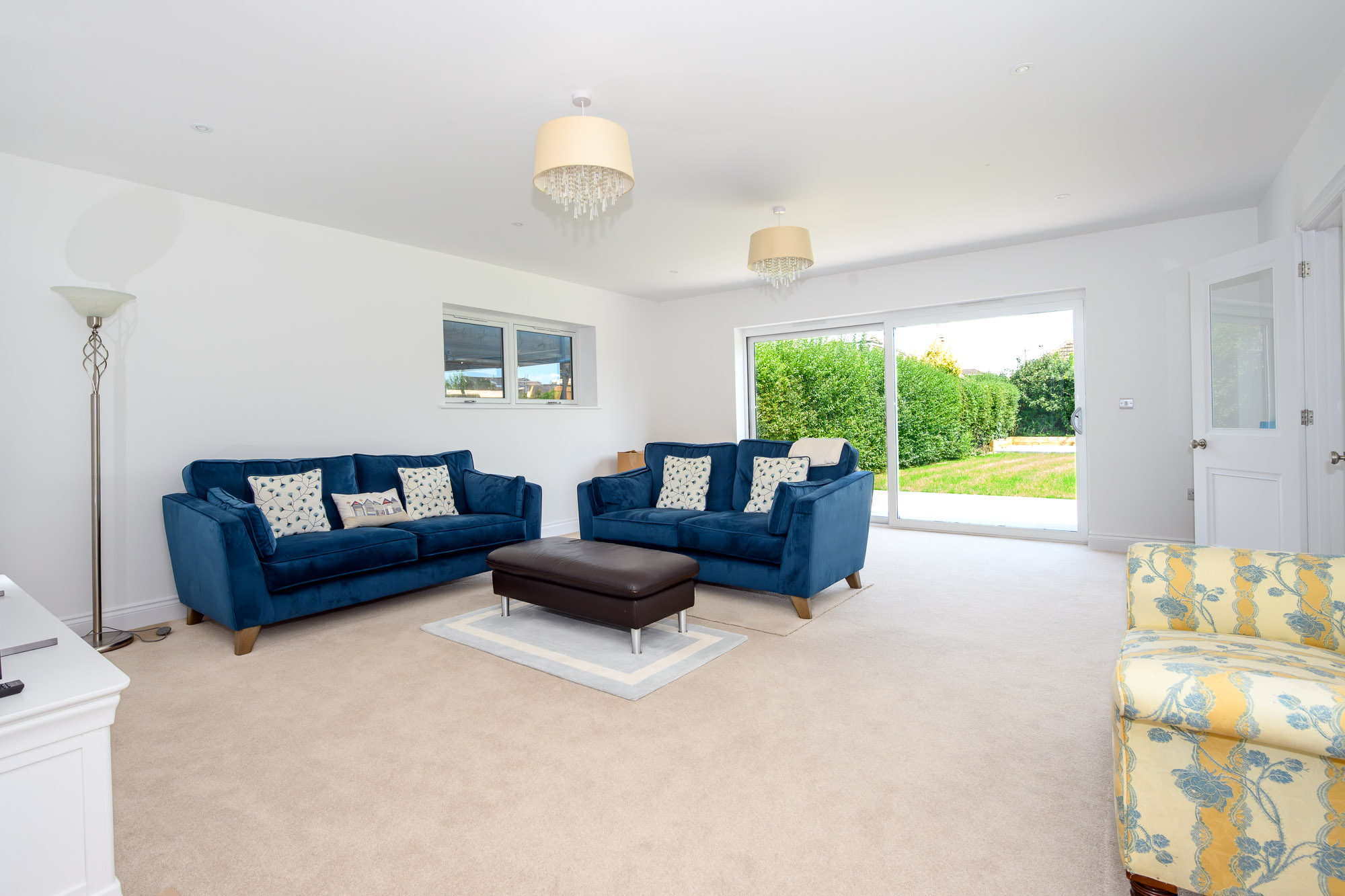 One set opens into a generously sized, square-shaped living room – ideal for relaxing or entertaining, with ample space for furniture and sliding patio doors that open directly onto the rear garden.