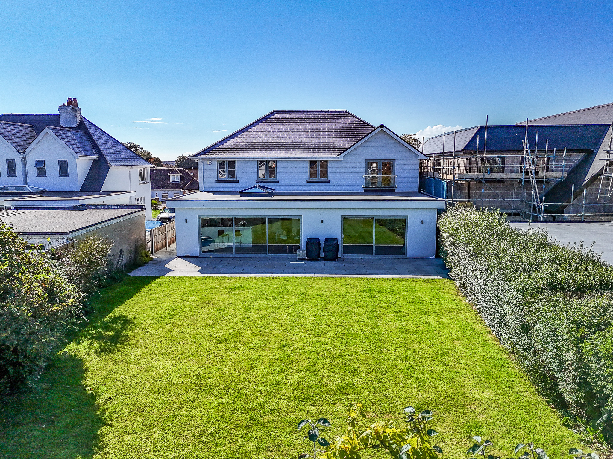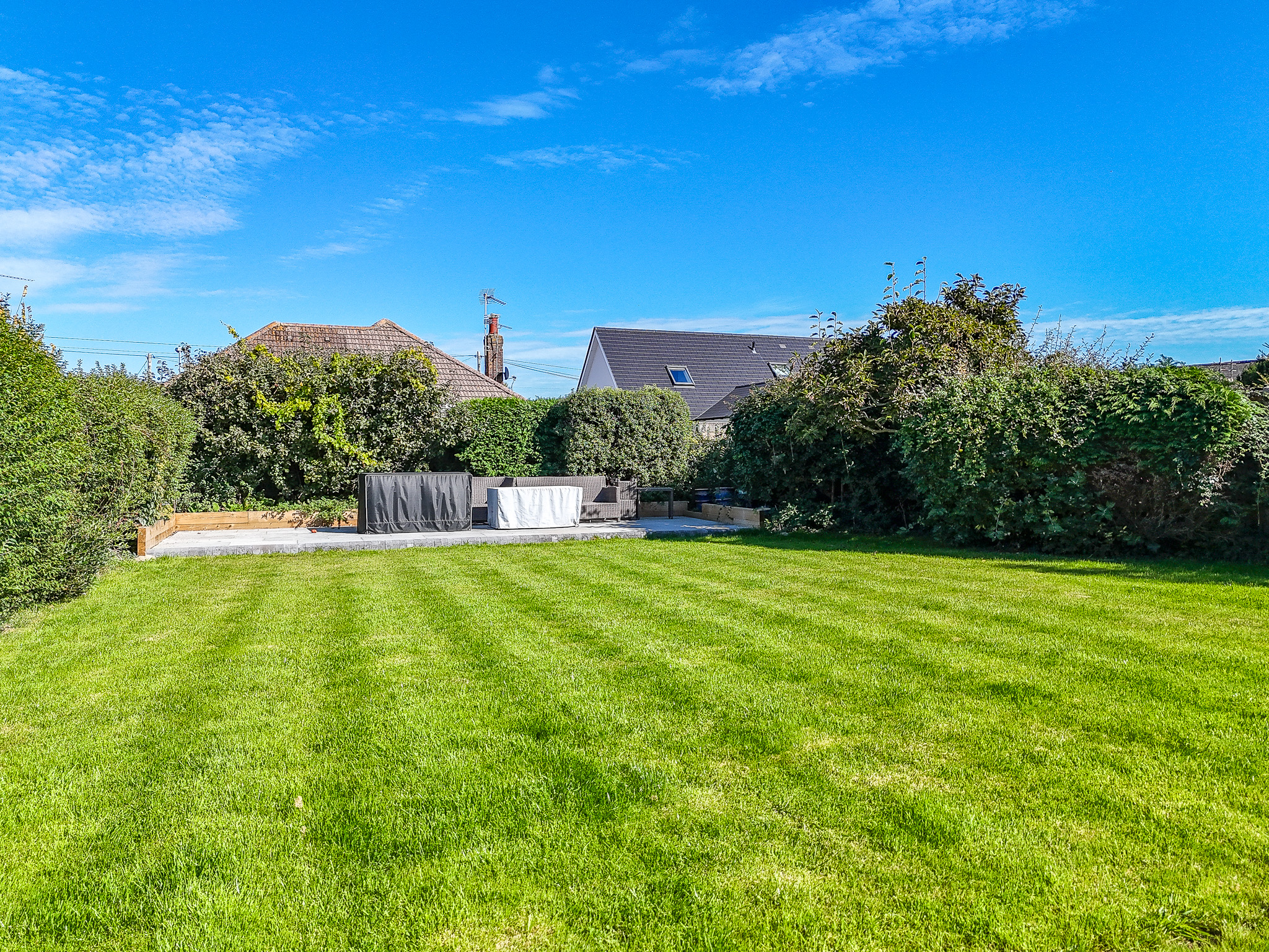 A secondary patio area at the end of the garden provides an ideal spot for a fire pit or additional outdoor seating – making the most of this generous outdoor space.
