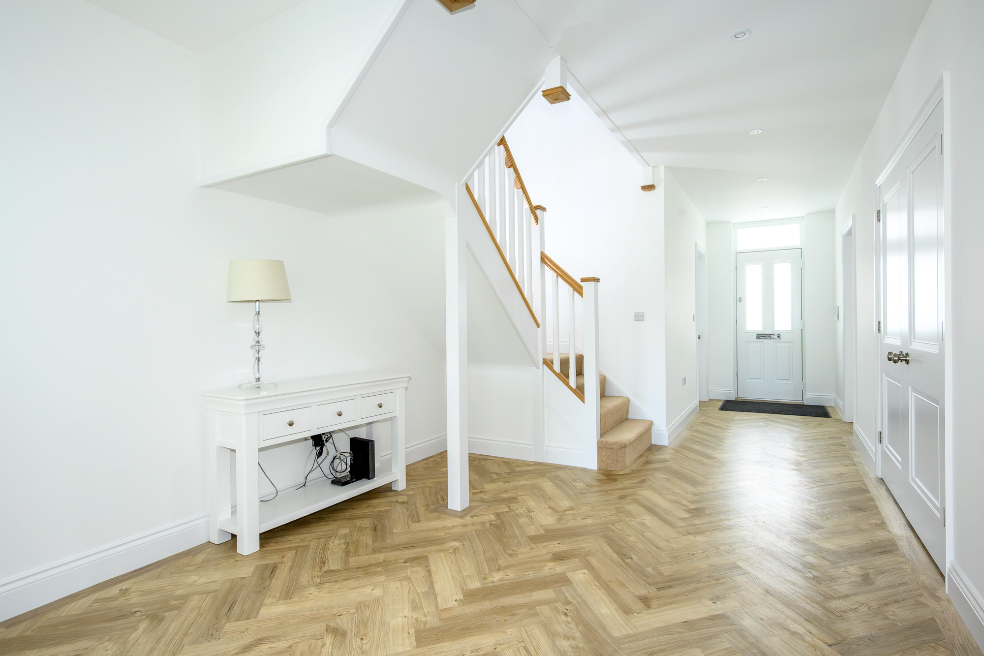 The hallway features stylish herringbone flooring, guiding you towards the heart of the home. Ahead of you, two sets of glazed double doors lead to the main reception rooms.