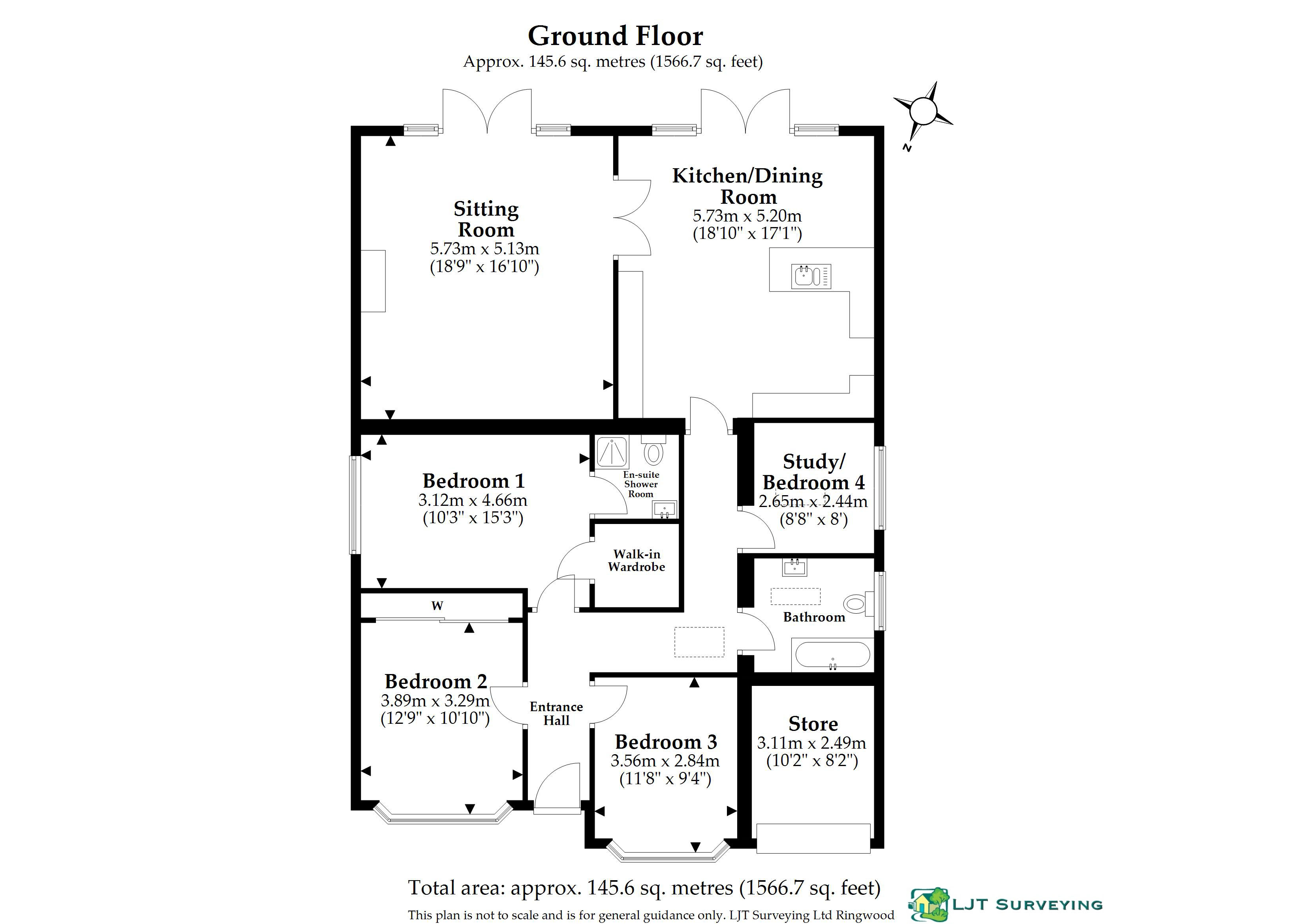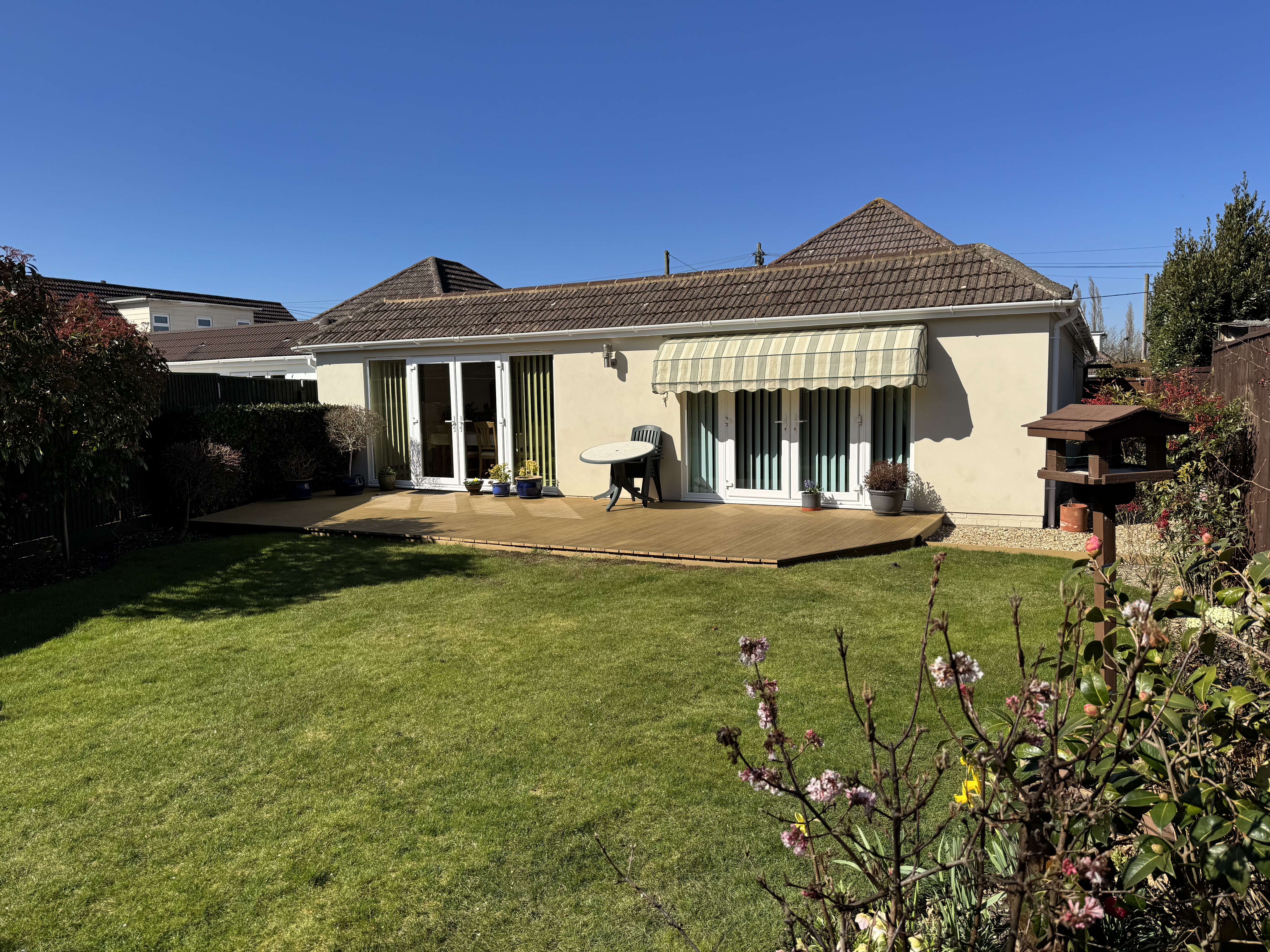 This well presented four-bedroom, detached bungalow offers nearly 1,600 sq. ft. of spacious living and is located within a desirable part of Ringwood. The heart of the home is a large bespoke kitchen/family room, complemented by a generous lounge with a feature fireplace. The master bedroom includes an ensuite and walk-in wardrobe, while bedroom two features full-height fitted wardrobes. Bedroom four can also serve as a study. A modern family bathroom/shower room serves the additional bedrooms. Outside, the private rear garden includes a large sun deck, with ample off-road parking, a workshop/storeroom and a garden shed.
