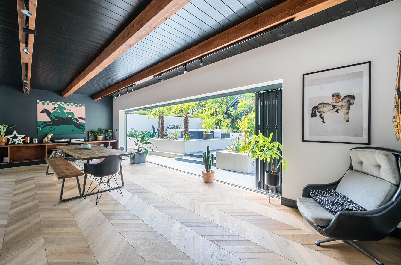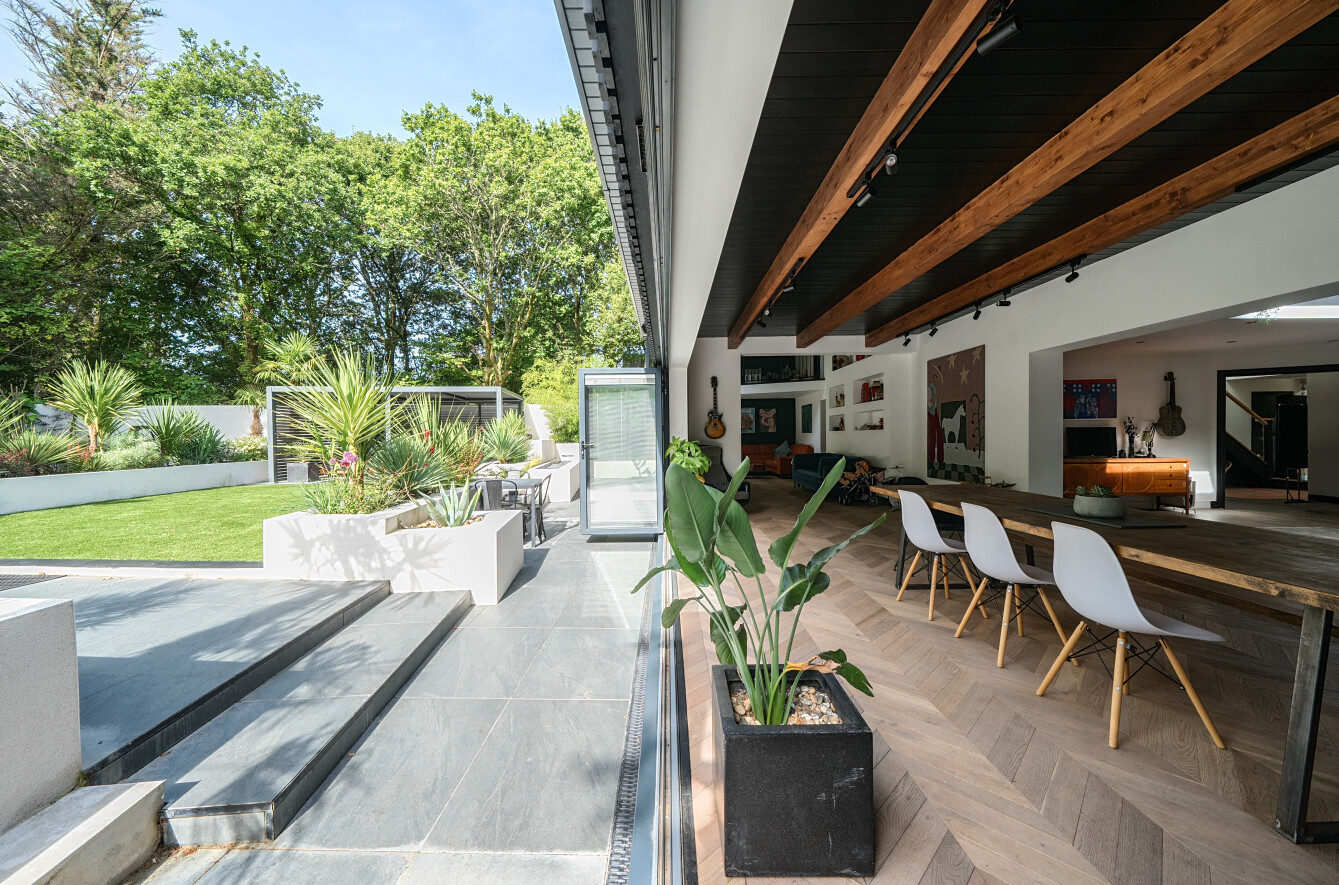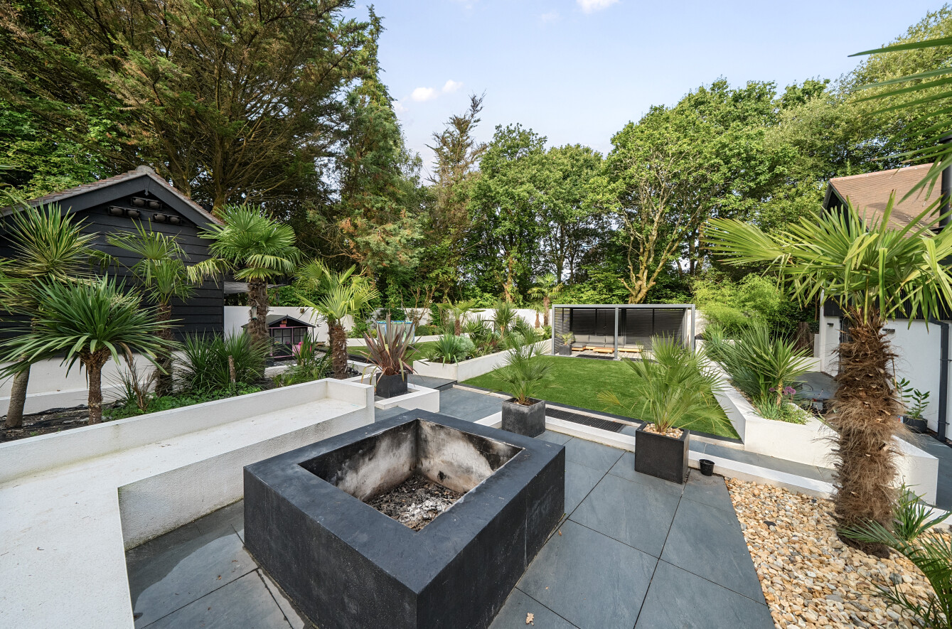 A bespoke architect designed home of contemporary style set on a quiet forest lane in the sought after hamlet of Woodlands. A four/five bedroom property with magnificent kitchen and open plan living spaces, two/three ground floor bedroom suites and two first floor bedroom suites. Garden studio and beautiful Mediterranean landscaped palm garden with alfresco seating areas.